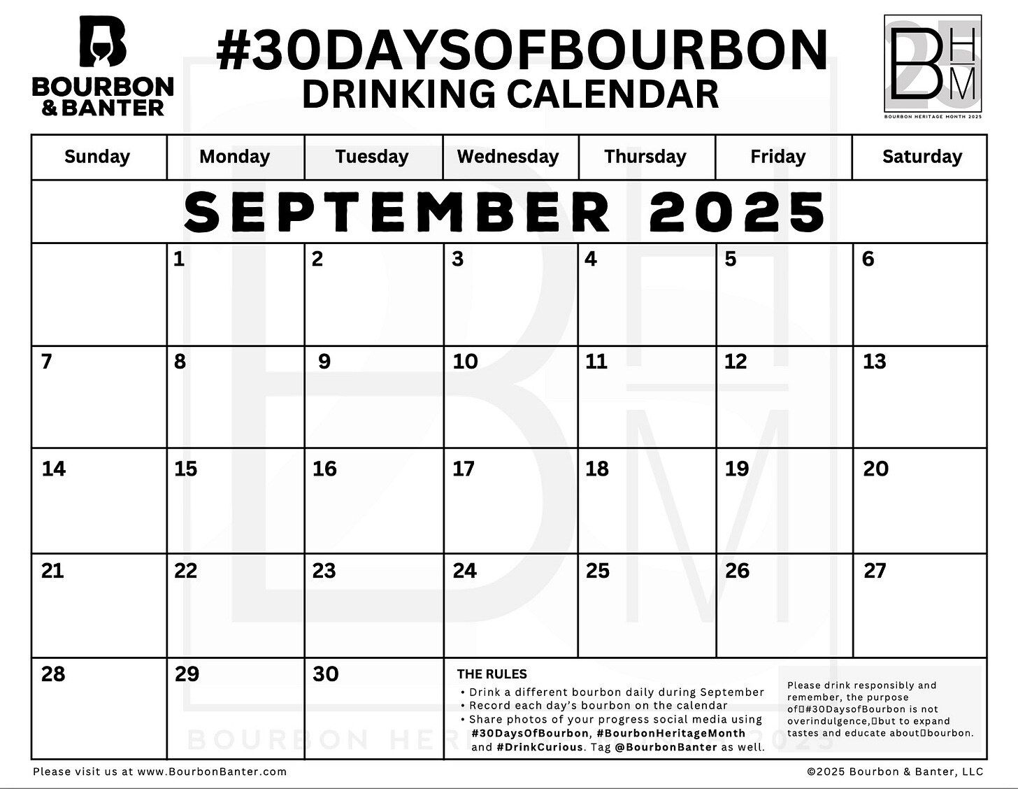 Bourbon & Banter’s annual 30 Days of Bourbon Challenge kicks off this September for Bourbon Heritage Month. The idea is simple: enjoy 30 different bourbons in 30 days—no rye, Scotch, or flavored whiskey, though Tennessee whiskey makes the cut. Participants are encouraged to mix it up with Bottled-in-Bond pours, finished bourbons, creative mash bills, and cocktails, all while tracking progress on the official calendar. Share your journey with #30DaysofBourbon, #BourbonHeritageMonth, and #DrinkCurious to join the community celebration of America’s native spirit. Visit Bourbon & Banter for a full guide, a downloadable PDF calendar, and social media overlays.