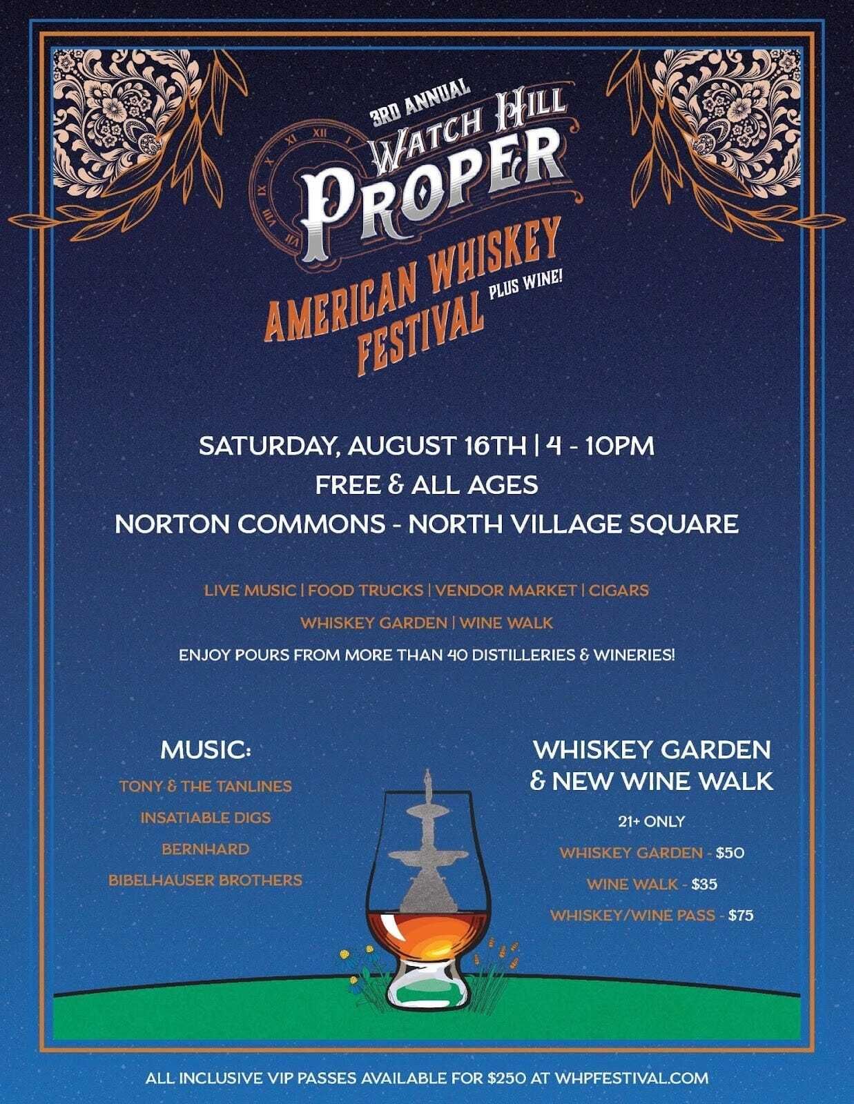 Louisville’s American Whiskey Festival is back for its third year on August 16, hosted by Watch Hill Proper at North Village Square in Norton Commons. What began as a whiskey-centric celebration has grown into a full-on summer bash, now featuring a brand-new Wine Walk alongside the beloved Whiskey Garden. With over 40 distilleries and wineries, live music, local vendors, food trucks, a cigar lounge, and family-friendly fun, the free event runs from 4 to 10 PM. Tasting experiences range from $35 to $250, with VIP access including exclusive pours and cuisine from Chef Michael Crouch. Tickets are on sale now at whpfestival.com.