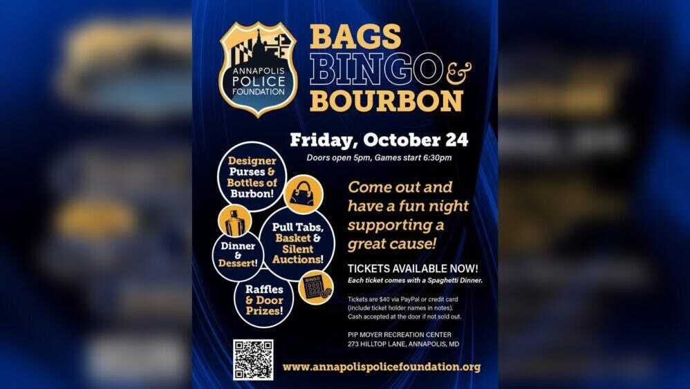 Mark your calendars for Friday, October 24, as the Annapolis Police Foundation hosts “Bags, Bingo & Bourbon” at the Pip Moyer Recreation Center. The evening kicks off at 5 p.m. with games starting at 6:30 p.m., offering raffles, silent auctions, and prizes that range from designer bags to top-shelf bourbon. Each $40 ticket includes dinner, dessert, and plenty of entertainment, with proceeds benefiting community programs and public safety efforts supported by the Foundation. Tickets can be purchased online at annapolispolicefoundation.org, or at the door if available.